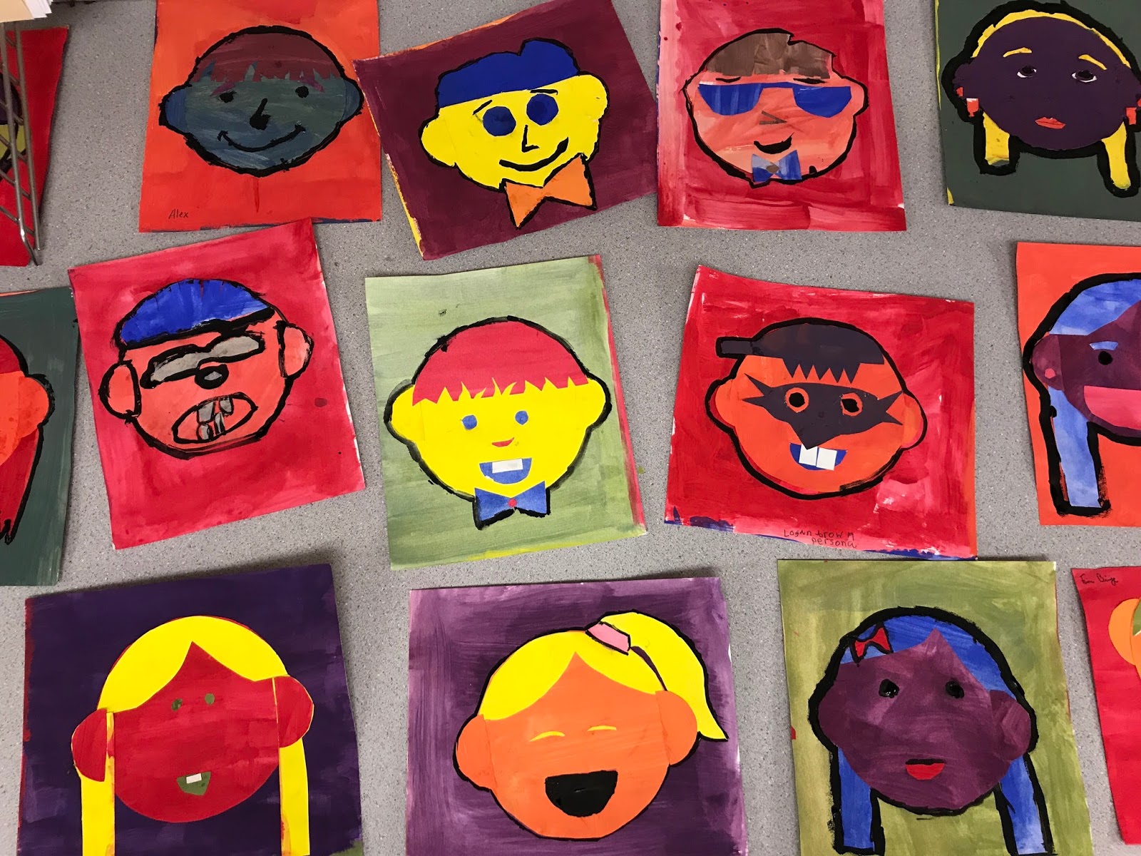 The artists had created a background using their knowledge of mixing colors. Then they cut out: head, ears, and extra details. We used collage techniques to assemble these masterpiece self portraits.